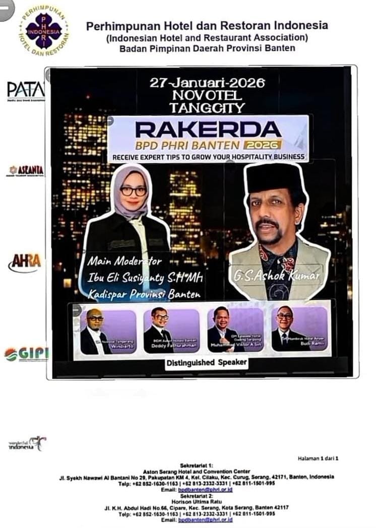 TANGERANG – Perhimpunan Hotel dan Restoran Indonesia (PHRI) Badan Pimpinan Daerah (BPD) Provinsi Banten menggelar Rapat Kerja Daerah (RAKERDA) pada Selasa, 27 Januari 2026, bertempat di Novotel Kota Tangerang. Kegiatan ini dihadiri jajaran pemerintah daerah, asosiasi terkait, serta pengurus PHRI dari delapan kabupaten dan kota se-Provinsi Banten.